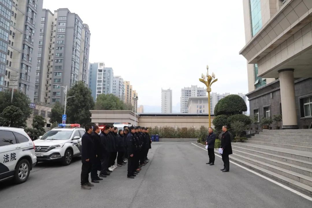 上午八点,竹山法院执行干警奔赴竹溪法院。在竹溪法院正门前,六辆警车整齐排列,执行干警列队整顿,两院执行局长做行动前动员部署。