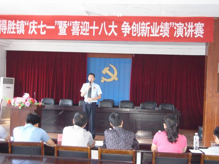 6月21日,为抒发爱党爱国情怀,讴歌身边的优秀党员和先进人物,迎接中国共产党成立91周年暨十八大的召开,得胜政府举办了全镇“庆七一暨喜迎十八大”演讲比赛,经过紧张激烈的角逐,得胜法庭书记员李楚振喜获第三名的好成绩。