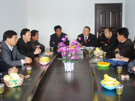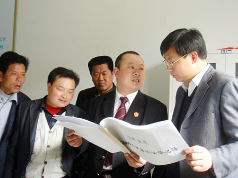 宝丰镇党委副书记、人大主席肖海(右一)和其他人大代表一同察看宝丰法庭2009年民事诉讼登记情况。