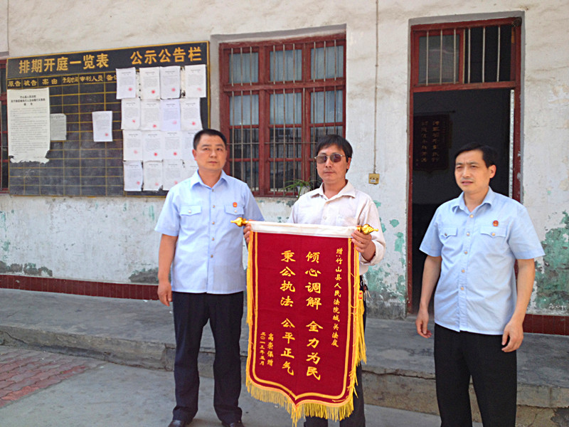 6月4日下午,潘口乡悬鼓洲村村民高某顶着烈日将一面“倾心调解,全力为民;秉公执法,公平正气”的锦旗送到城关法庭,向法官们表达自己的谢意。