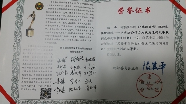2015年11月23日,当秦古法庭干警任奇收到中国法学会为其颁发的“中国法学青年论坛三等奖”的荣誉证书时,秦古法庭全体干警无不为之感到欢心鼓舞。