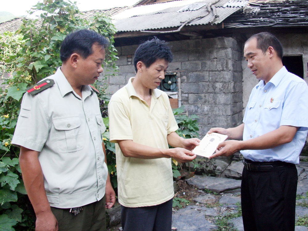针对农村军属交通不便、维权意识不强等特点,我院每逢八一前夕与当地武装部上门为军属赠送法律手册,提供法律咨询,将法律送到军属身边,这种“零距离”的法律服务深受广大军属的欢迎。图为7月23日,我院官渡法庭法官与镇武装部工作人员为军属王茂根赠送法律手册和讲解法律。
